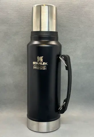 Con su robusta construcción de acero inoxidable y un elegante acabado en negro mate, este termo de 1.2 litros lleva grabado el icónico logo de Stanley y la palabra "MESSI", rindiendo homenaje a la grandeza. Mantiene tus bebidas calientes o frías hasta por 32 horas y el hielo por hasta 160 horas, ideal para cualquier aventura, jornada laboral o para acompañarte en cada partido. Su manija ergonómica asegura un transporte cómodo, haciendo de este termo un artículo de colección y uso diario.